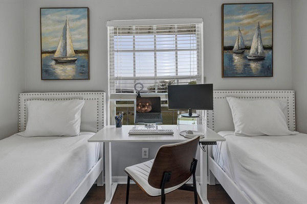 Two twin beds with work station. Office printer also available.